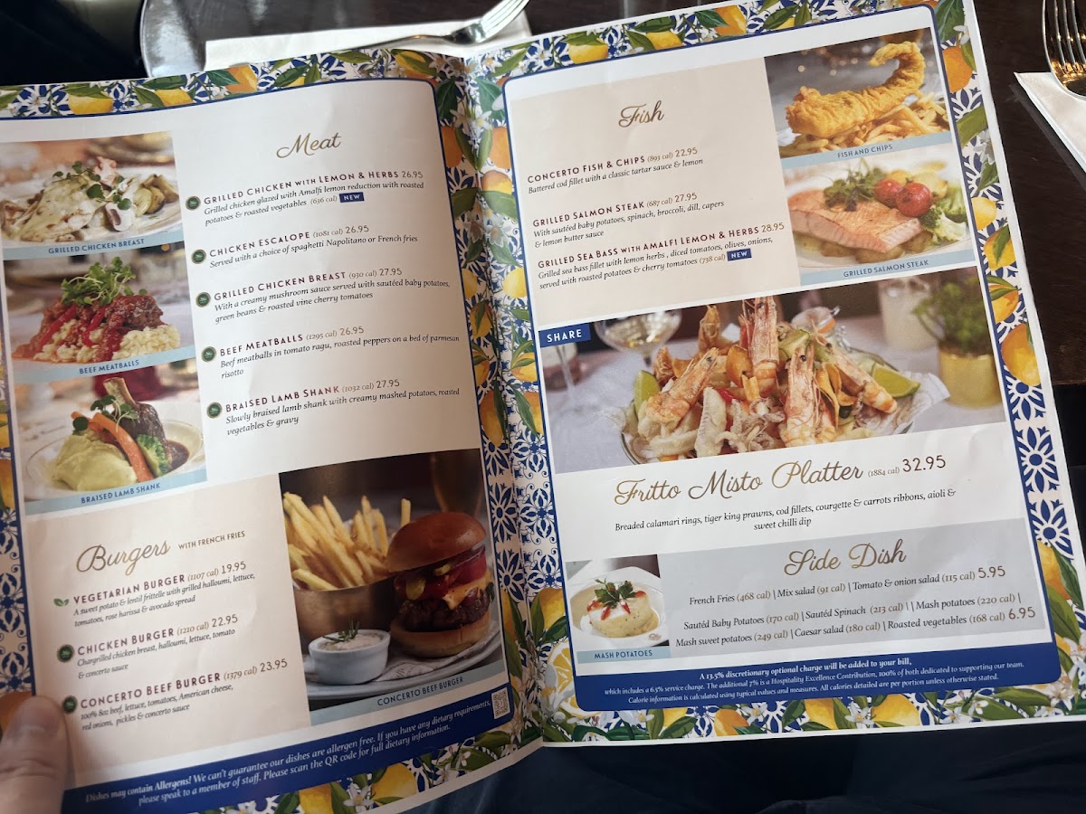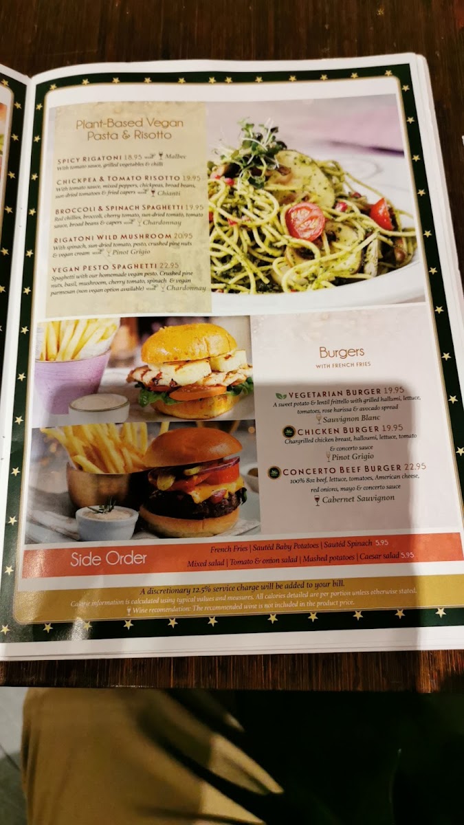 Caffe Concerto's menu shines with its range of hot drinks and rustic artisanal pizzas that tantalize the taste buds. Whether you're in the mood for a cozy Concerto Hot Chocolate (£5.25) or a vibrant Spanish Latte (£5.95), there's something to satisfy every palate. For those seeking a heartier option, their selection of Rustic Artisano Pizza is a must-try, with choices like the classic Margherita (£18.95) and the delectable Fritto Misto Platter (£28.95), perfect for sharing or savoring solo. There's even a delicious gluten-free option, with the rich and moist Carrot Cake (£6.95) to indulge in.